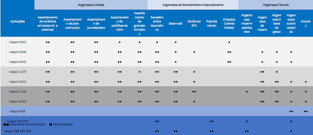 A versatilidade das resinas redispersível da linha Vaepol permite sua aplicação em diversos segmentos, incluindo: